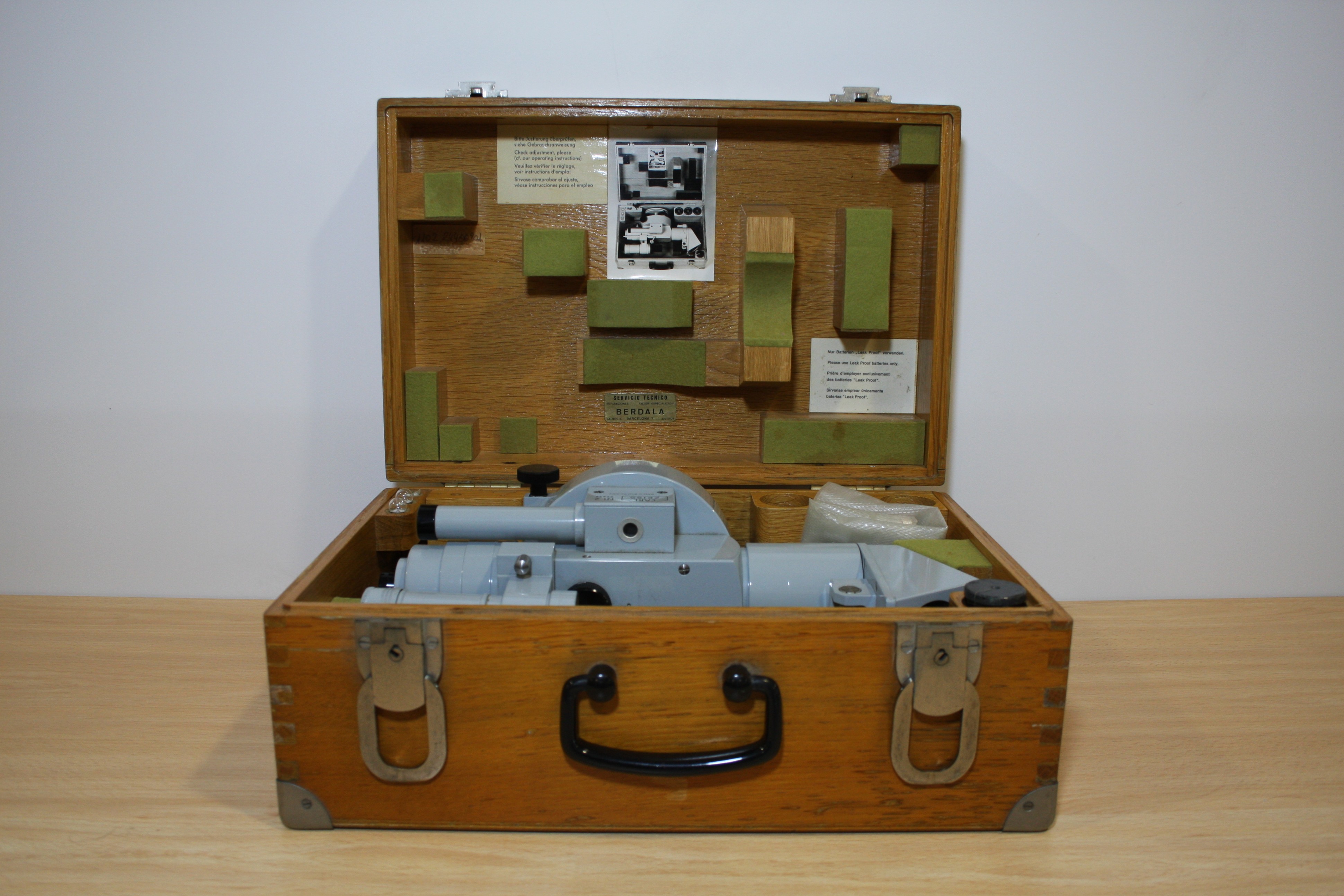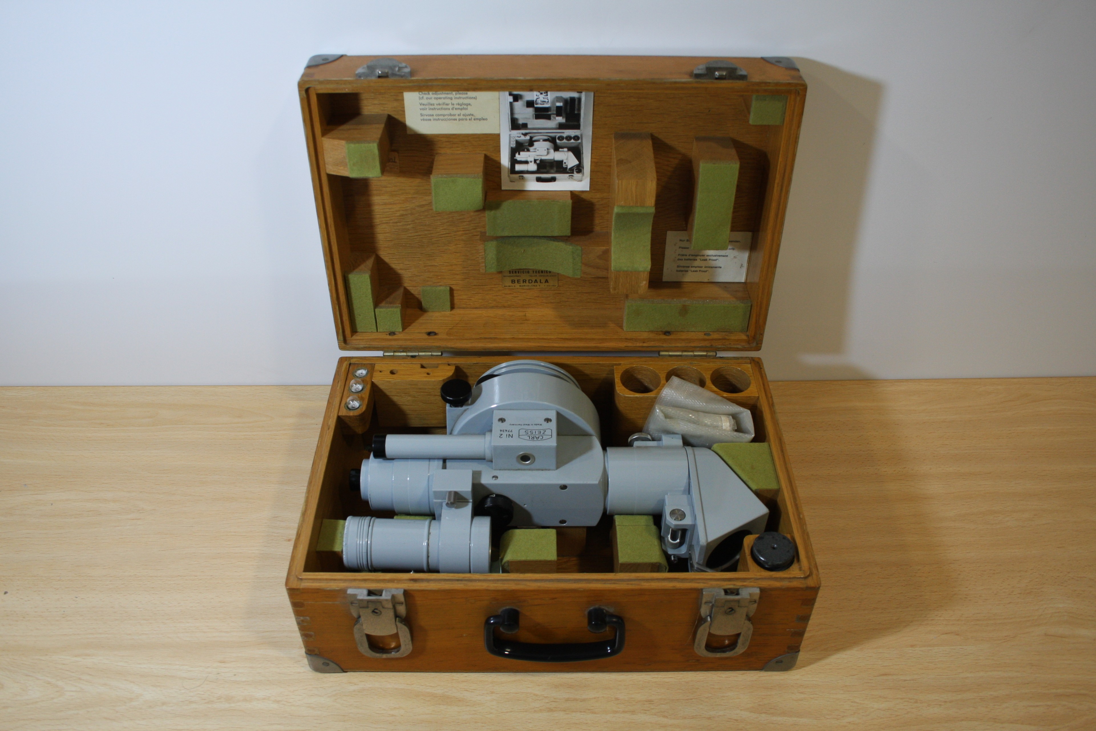 Instrument de metall de color gris clar format per un nivell automàtic Ni2, corresponent al cilindre central i base circular de l’instrument, al qual s’ha afegit un astrolabi de prisma de 60º, situat en l'extrem oposat a l'ocular, de forma prismàtica. Aquest instrument permet determinar amb gran exactitud el temps, la latitud i l’orientació (azimut) d’un punt d’observació. L'instrument es guarda en un maletí de fusta.