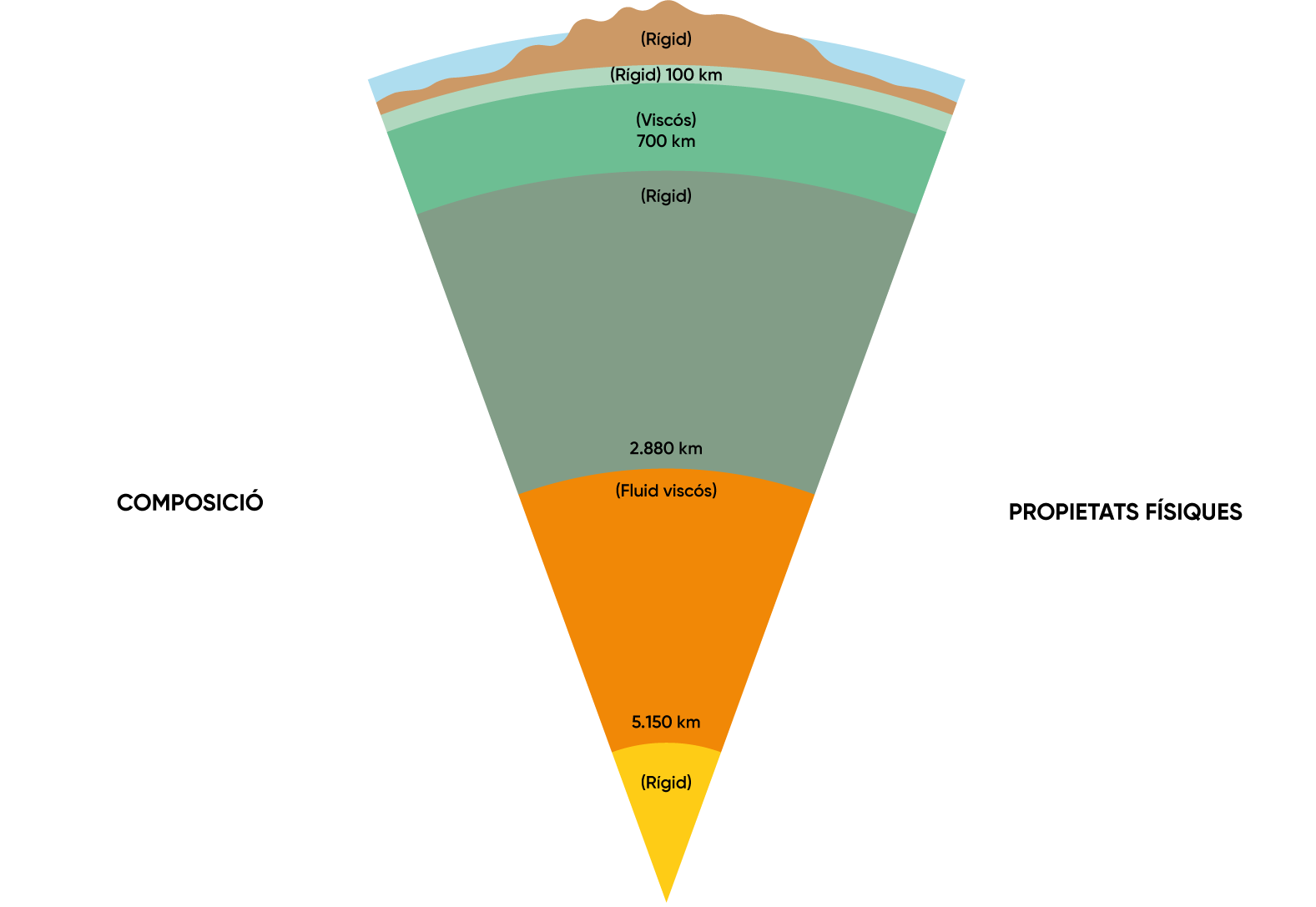 Capes de la Terra segons la composició i propietats físiques, amb les seves fondàries (el gruix de l’escorça, l’oceà i la litosfera no estan a escala).